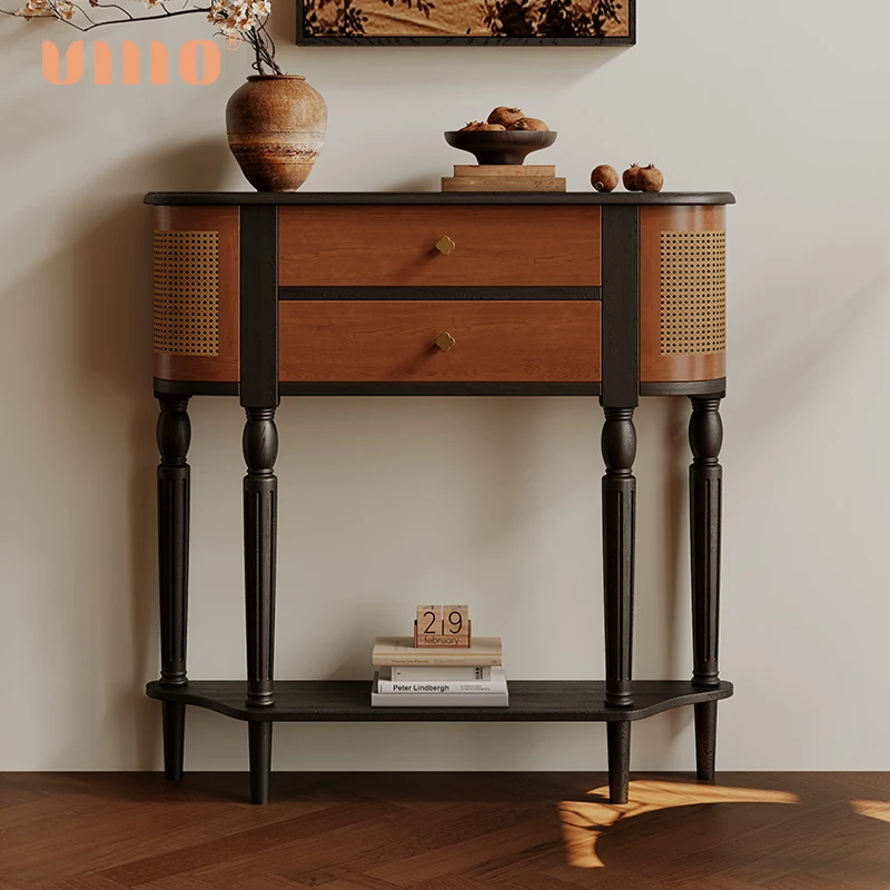【ULLLO】アメリカンスタイルの天然木エントランスキャビネット – フレンチビンテージの魅力、リビングルームを格調高く飾るサイドキャビネット&ディスプレイキャビネット