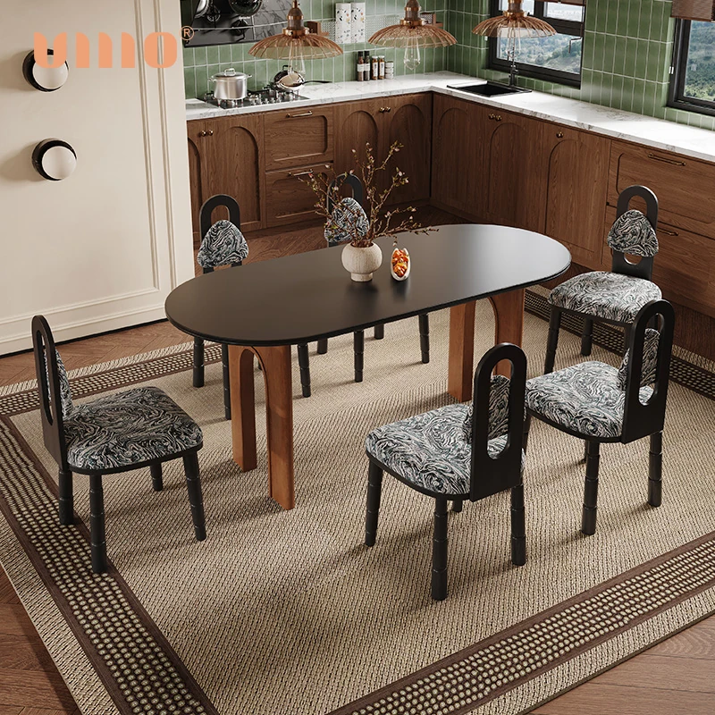2023年新作ULLLOフランス風レトロダイニングテーブル:小スペースにぴったり!エレガントなオーバルのデザイン、耐久性抜群の黒色セラミック天板、実用的な天然木使用。