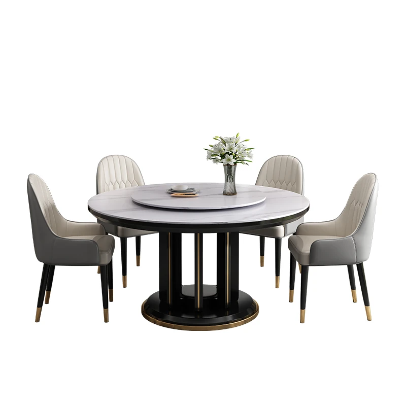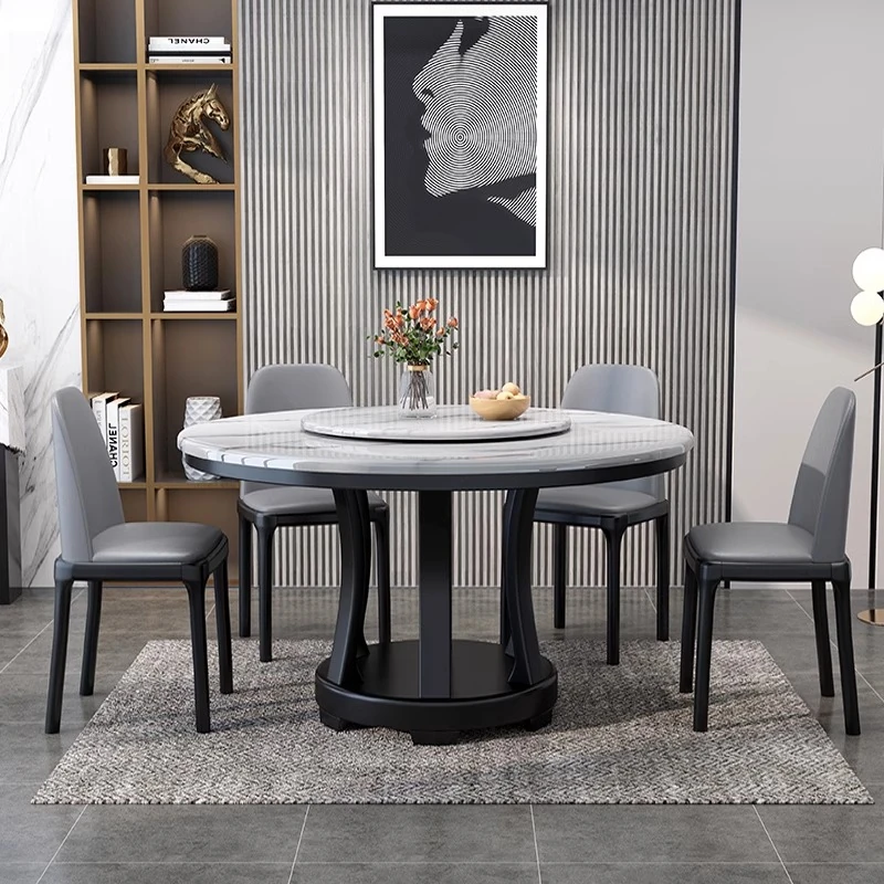 高級感あふれるモダンなラウンドダイニングセット - 高級岩板使用、回転盤付きの軽奢大理石テーブルと実木チェアで贅沢なひとときを。