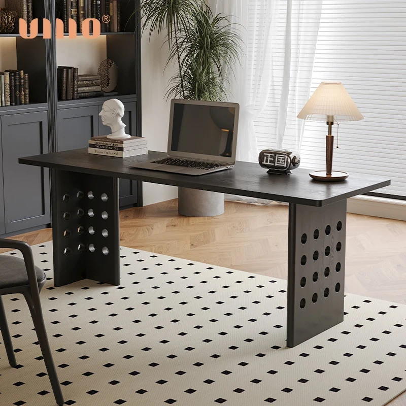 【ULLLO】エレガントなフレンチヴィンテージ無垢材デスク - 北欧シンプルスタイル!天然木の美しさを活かしたアンティーク談話テーブル、オフィスにぴったりの多用途ロングワークステーション