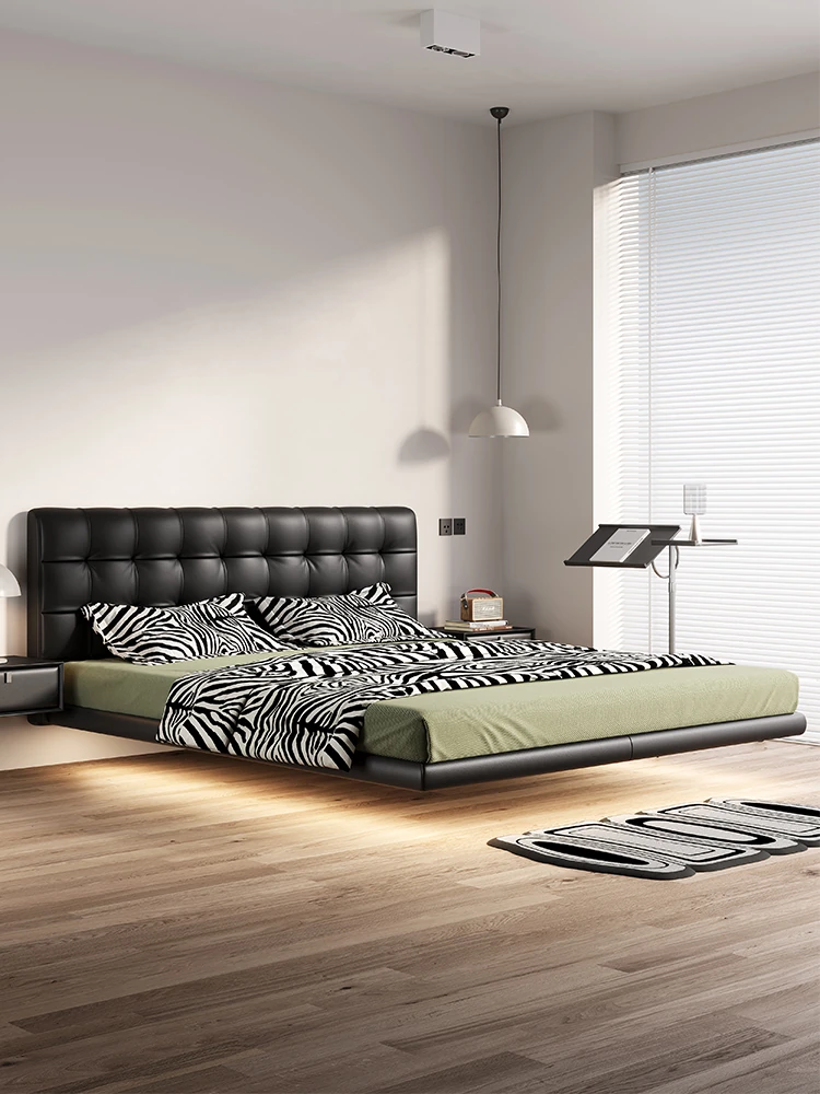 イタリアンミニマルデザインの浮遊式モダンレザーベッド:収納付きで主寝室に最適!本革を使用した贅沢な空中フローティングベッドで、エレガントな雰囲気を演出。