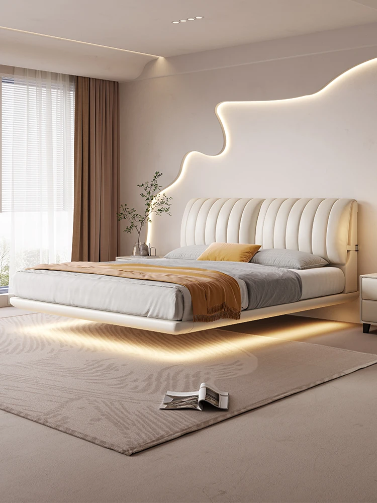 象の耳本革浮遊ベッド - モダンでシンプルなデザインの主寝室用、柔らかなクッション付きのフローティングベッド。クリーム風センサーライト付きで、よりリラックスできるダブルベッド。