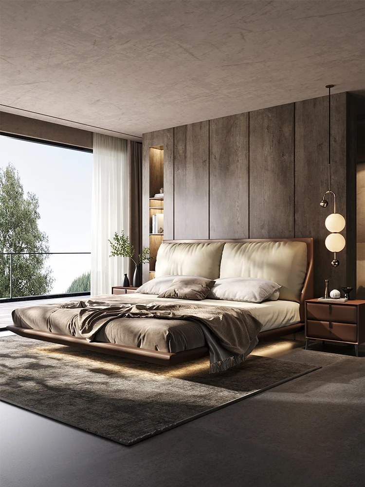 Italian Minimalist Floating Solid Wood Bed with Storage and Genuine Leather Upholstery - Elegance and Functionality Combined