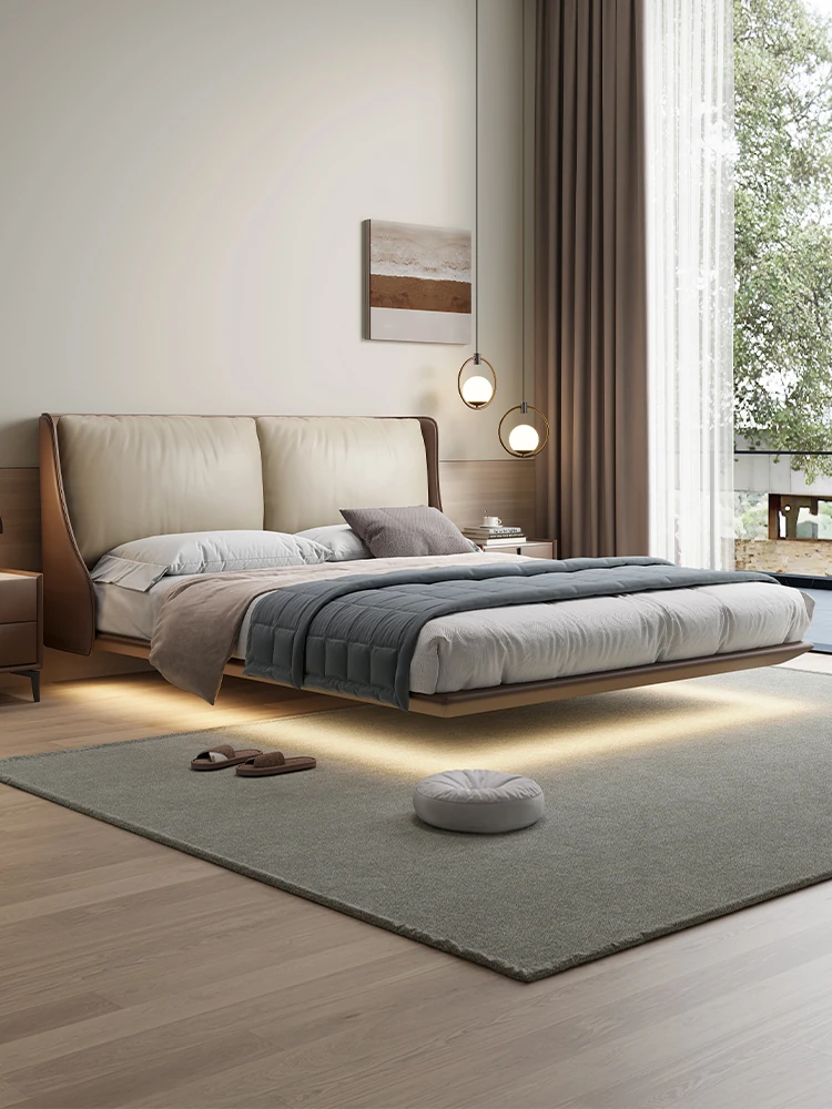Italian Minimalist Floating Leather Bed - Luxurious Master Bedroom Beech Wood Storage Bed, Elegant High-End Solid Wood Design