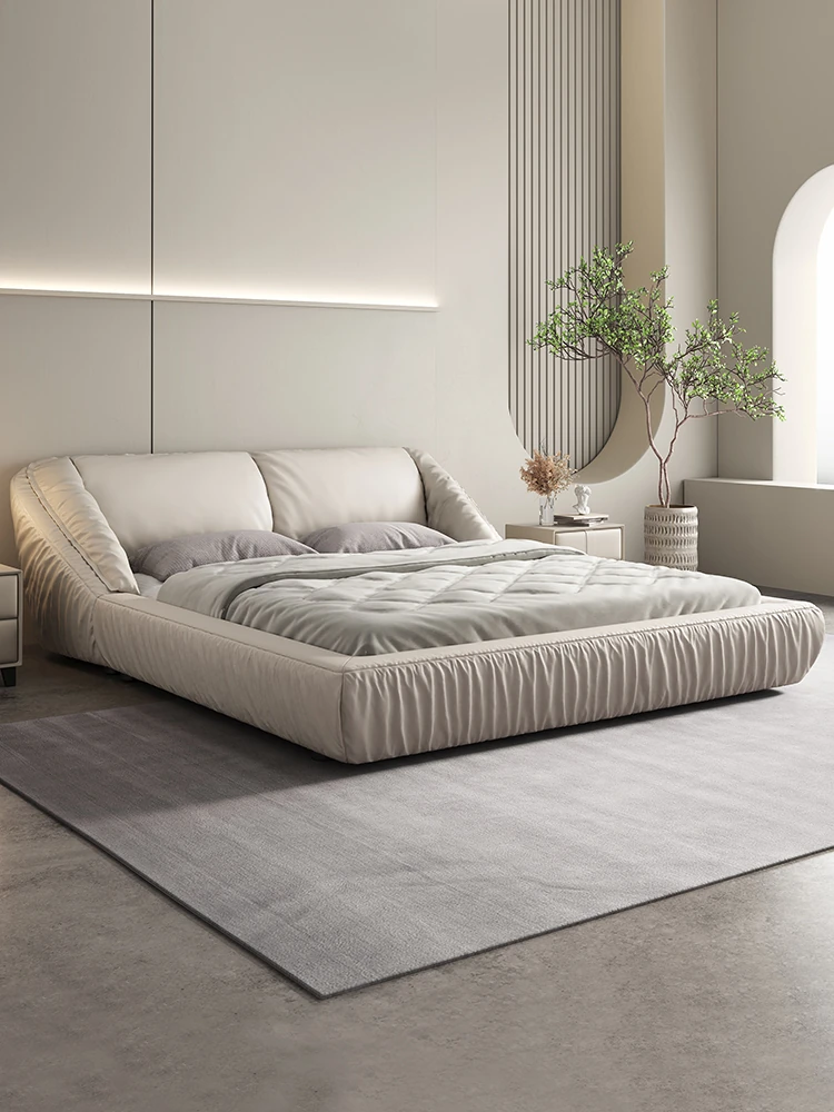 Italian Minimalist Genuine Leather Elephant Ear Bed - Luxurious Modern Simple Design with Soft Feather Down Backrest for Master Bedroom - High-End and Elegant Wedding Bed