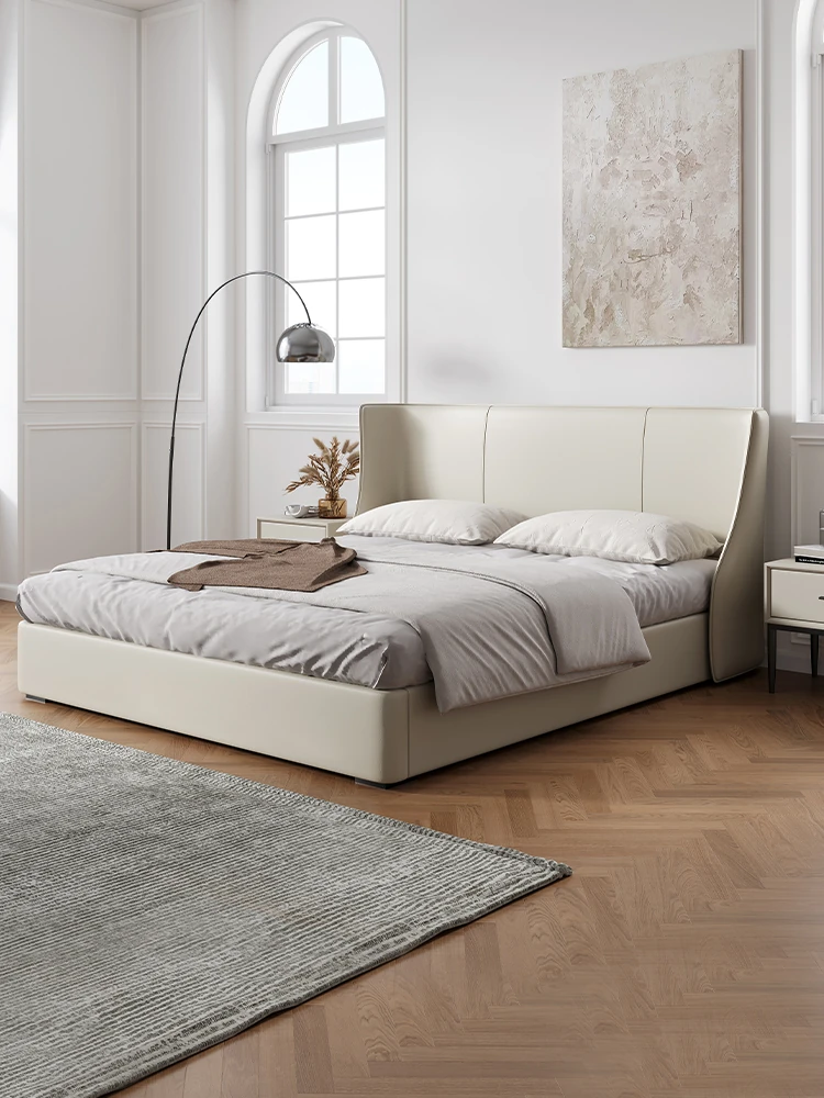 Italian Genuine Leather Bed - Luxurious Modern & Minimalist Design for Master Bedroom, High-End Feathered Wedding Bed with Nordic Simplicity and Unique Elephant Ear Headboard