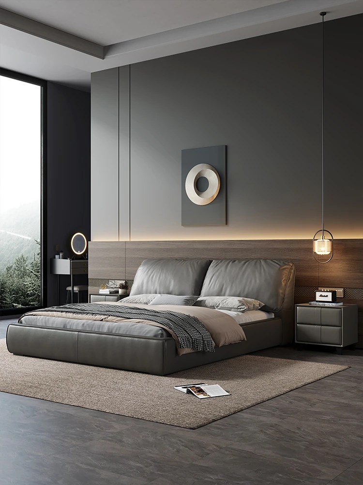 Genuine Leather Bed - Modern Minimalist Master Bedroom Design, Luxurious Italian-Style Storage Double Bed with Top Grain Leather Upholstery for a Cozy Embrace