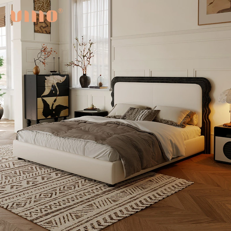 ULLLO French Cream Ripple Design Bed - Modern Minimalist Genuine Leather 1.8m Master Bedroom Wave Bed - Stylish Contemporary Double Bed