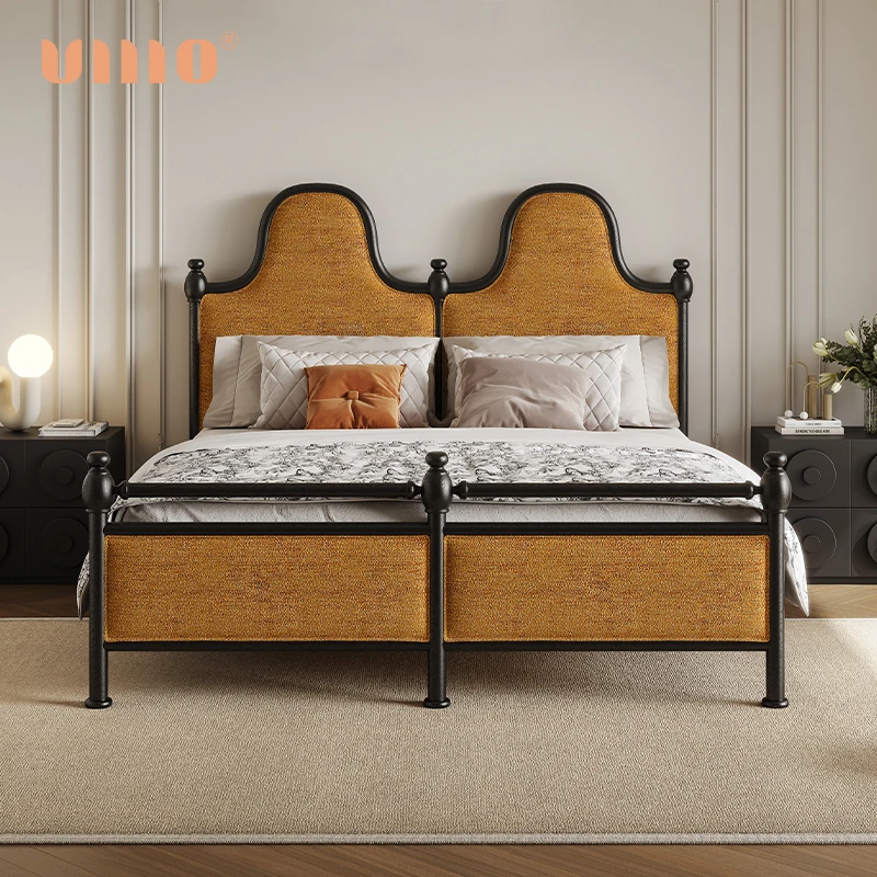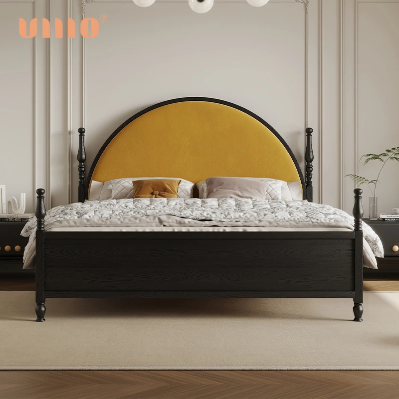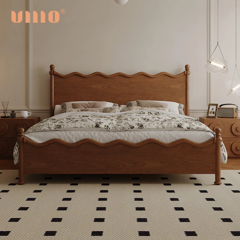 ULLLO French Vintage Minimalist Solid Wood Double Bed - 1.8m Main Bedroom Marriage Bed with Trendy Round Backrest - Ideal for Modern Aesthetic and Cozy Spaces - Perfect for Couples and Stylish Interiors!