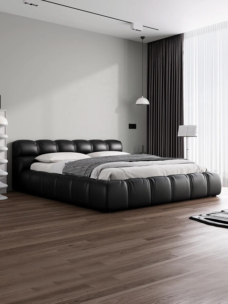 Luxurious Modern Minimalist Genuine Leather Bed - High-End Double Bed with Premium Top-Grain Leather and Feather-Filled Cushioned Headboard, Nordic Italian Style