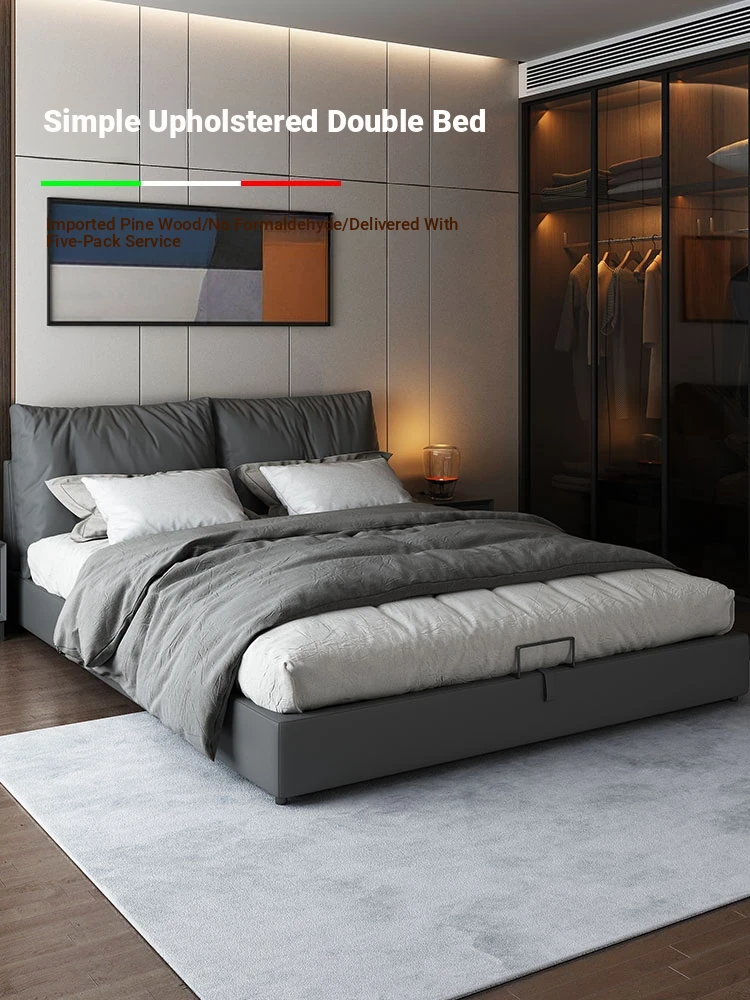 Modern Minimalist Italian Leather Bed - Luxurious Nordic Small-Space Design with High-Storage Soft Upholstered Headboard