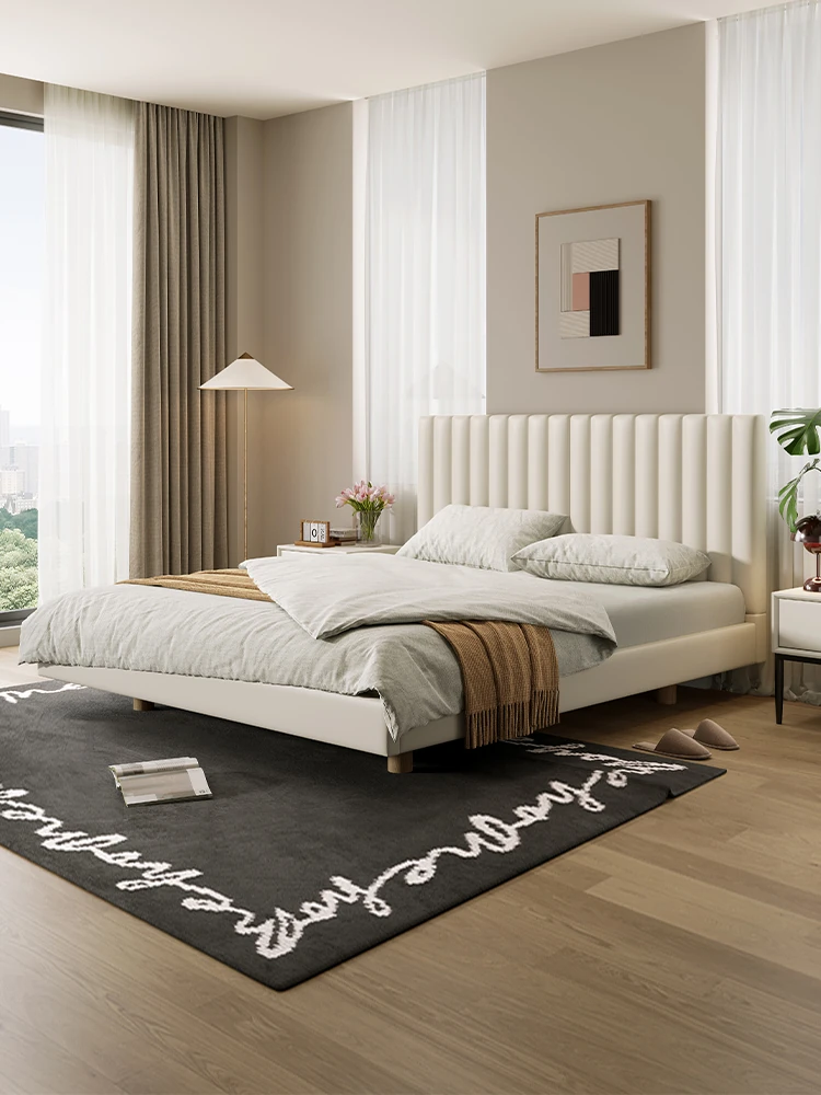Luxurious Genuine Leather Bed with Modern Minimalist Design - Features Top-Grain Leather and Nordic French Style for Your Master Bedroom. Eye-catching Floating Piano Key Design in Trendy Cream Color, Perfect for a Stylish Wedding Bed.