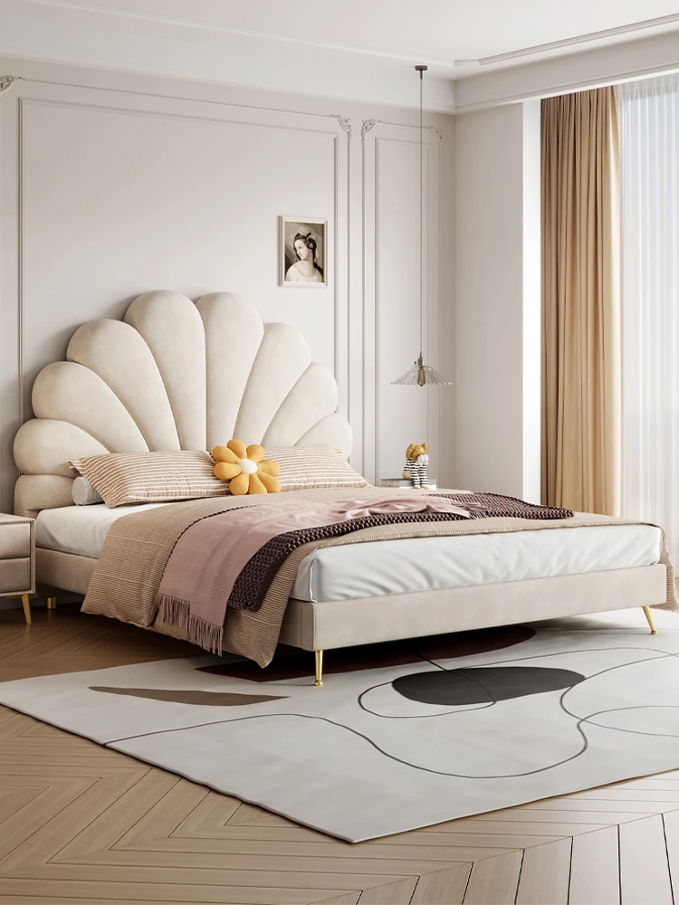 Luxury Modern Nordic Petal Bed with Soft High-Tech Fabric Headboard - Chic French Style Cream Bed for Master Bedrooms