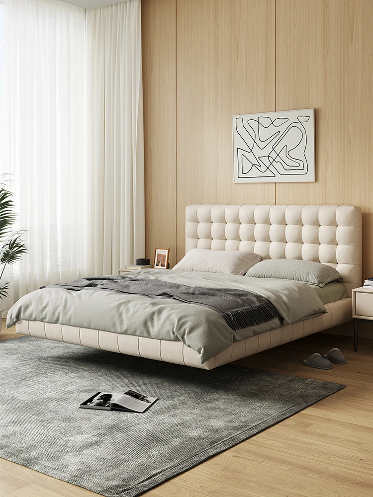 Modern Minimalist Luxury Floating Bed - Elegant Master Bedroom Design with Italian Premium Leather and Down-Feather Soft Headboard for a Sophisticated Touch