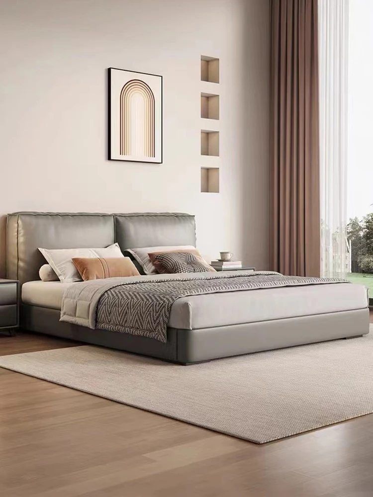 Italian Minimalist Genuine Leather Bed: Luxurious & Modern Solid Wood Soft Headboard - Perfect for Master Bedrooms