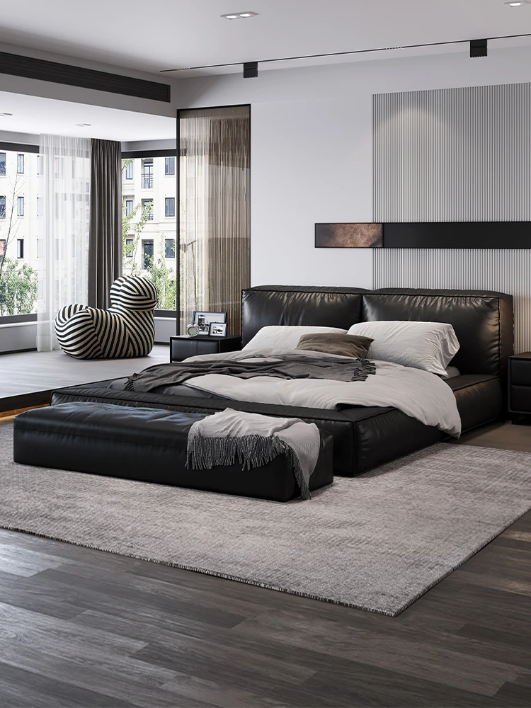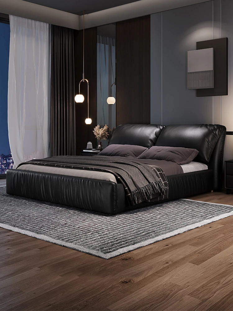 Italian Minimalist Genuine Leather Bed - Modern Nordic Design with Storage for Master Bedroom - Large, Chic Black Double Bed Perfect for Newlyweds