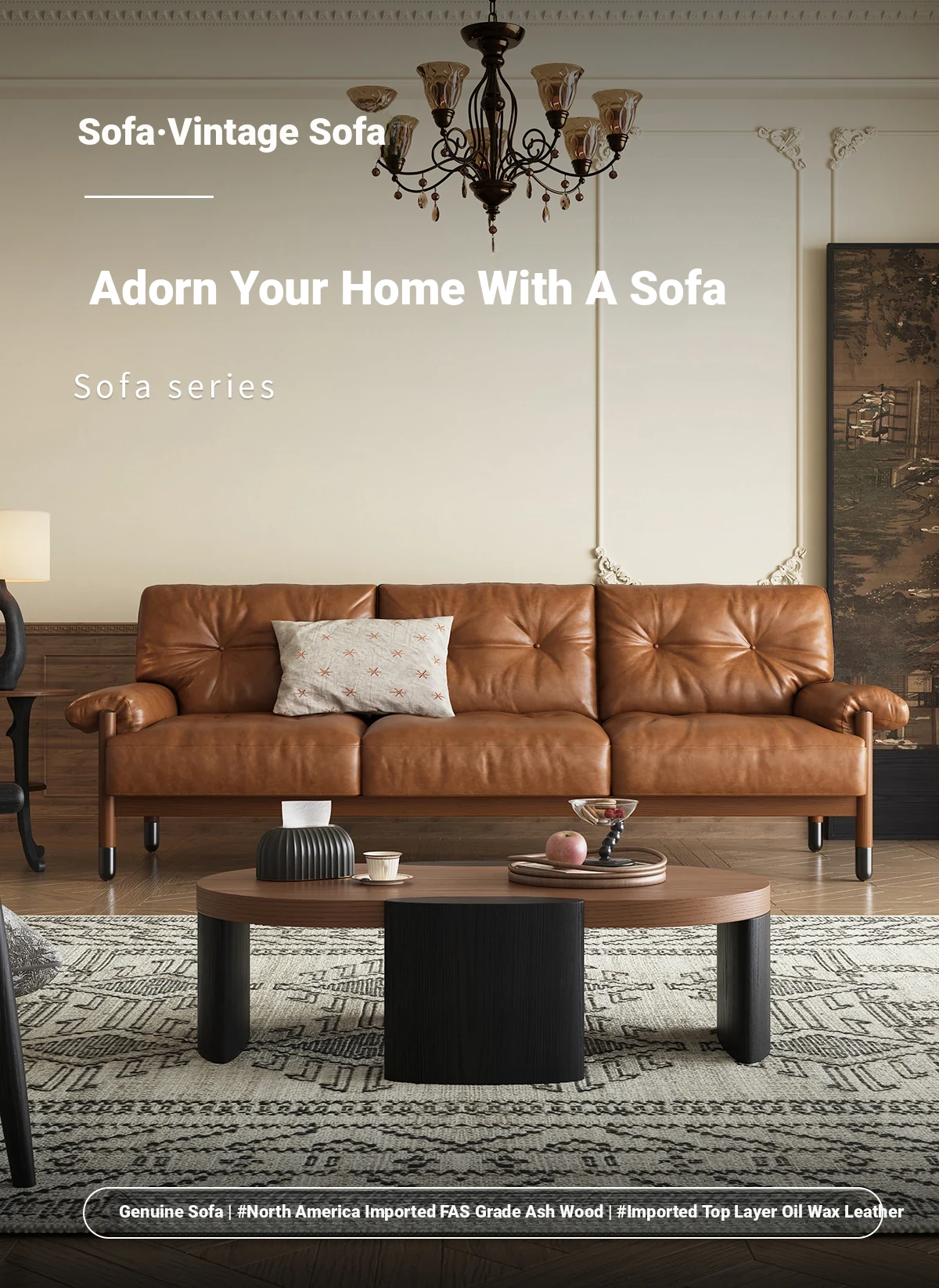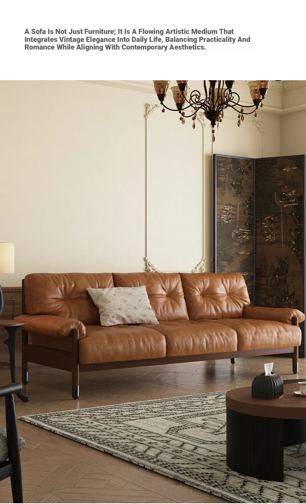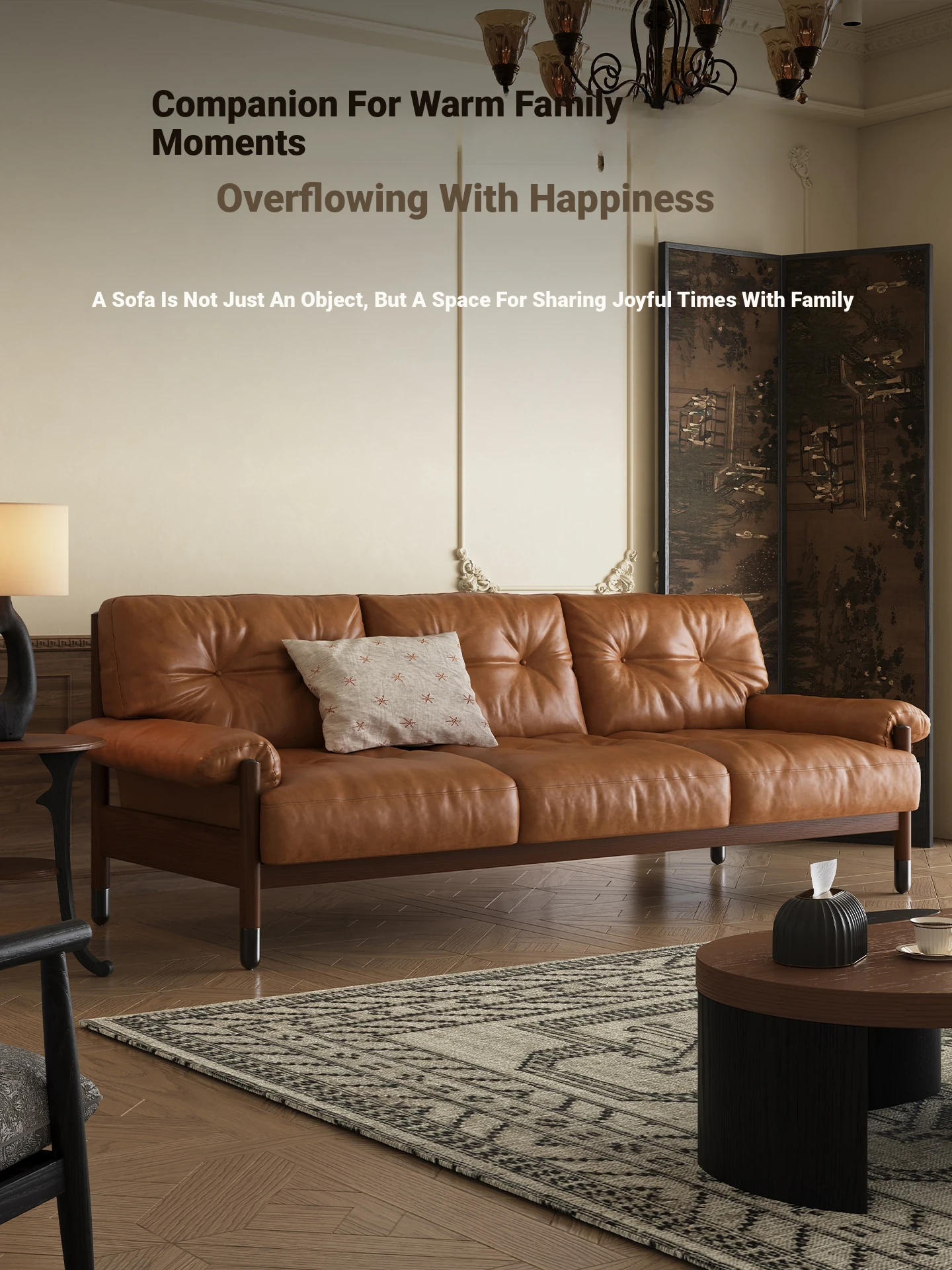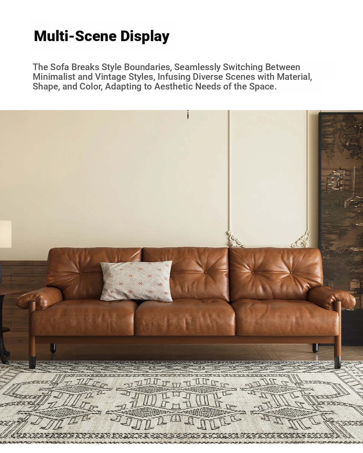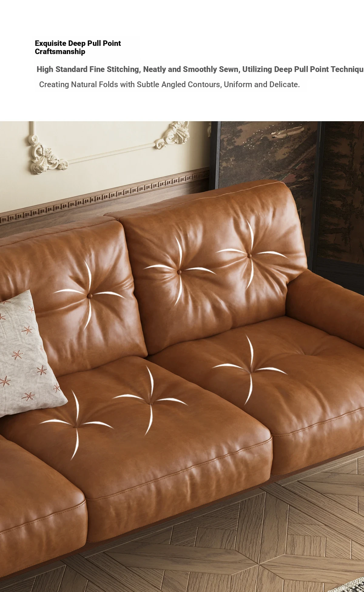 ULLLO French Vintage Solid Wood Sofa - Waxed Genuine Leather Designer Three-Seat Sofa for Living Room with Starry Design