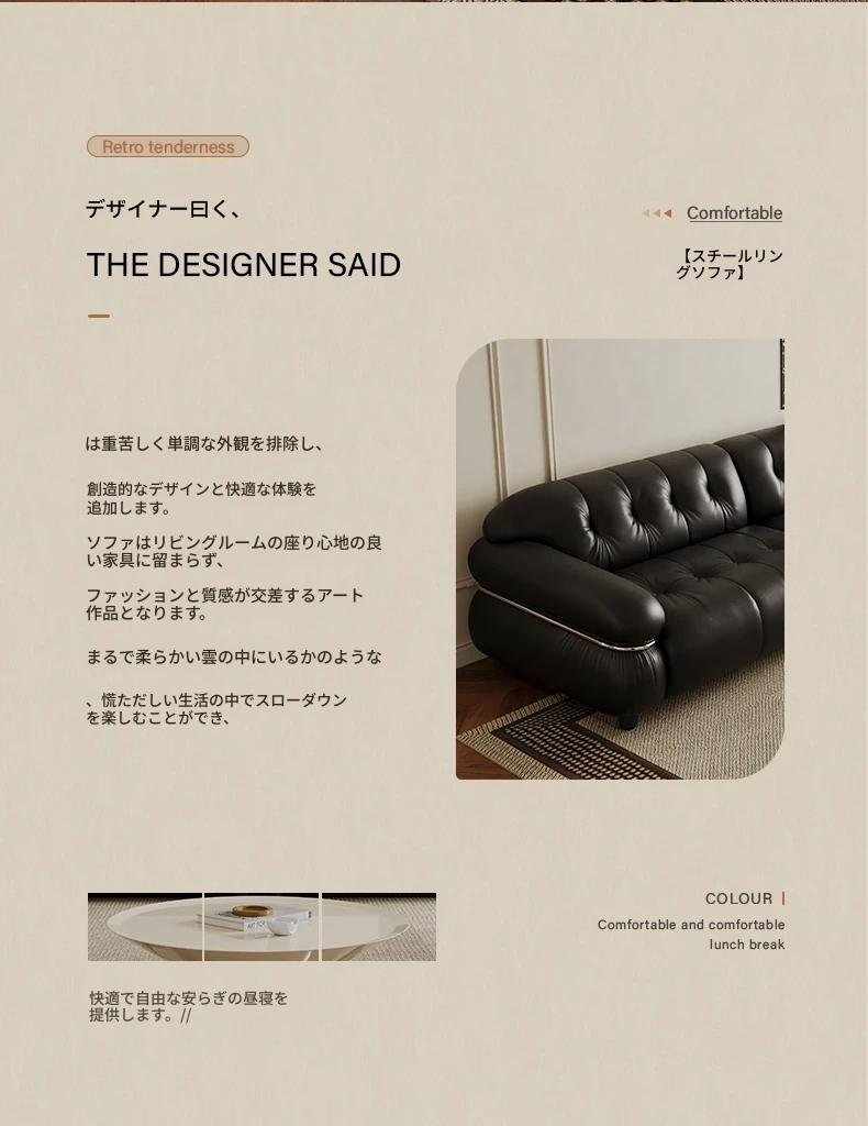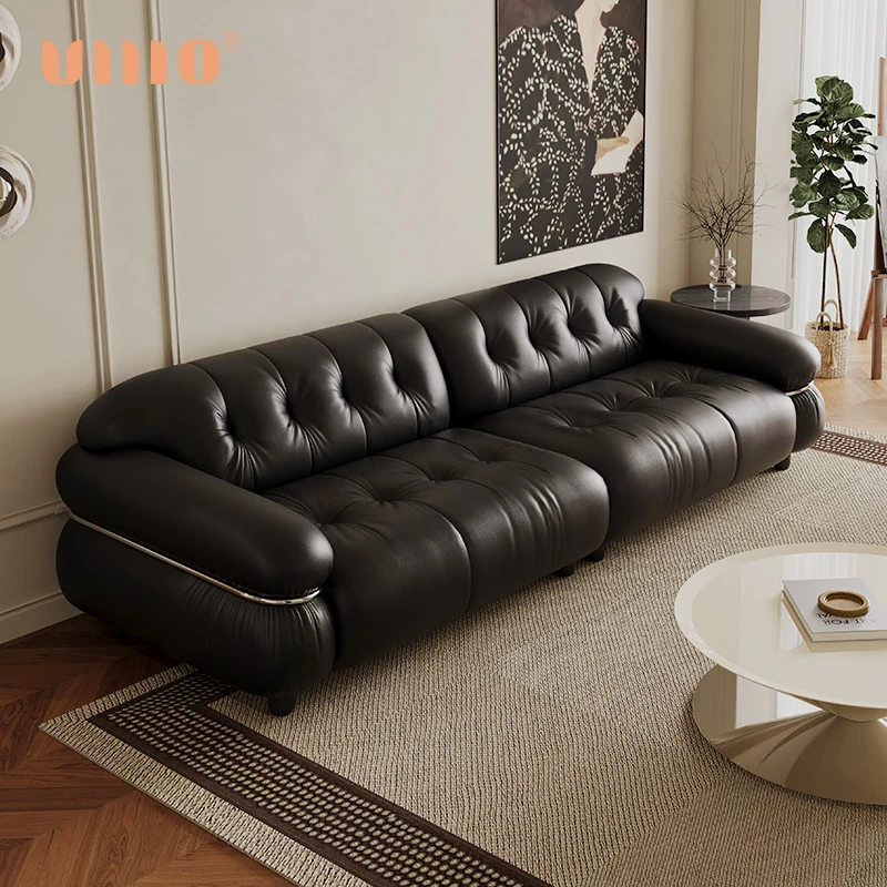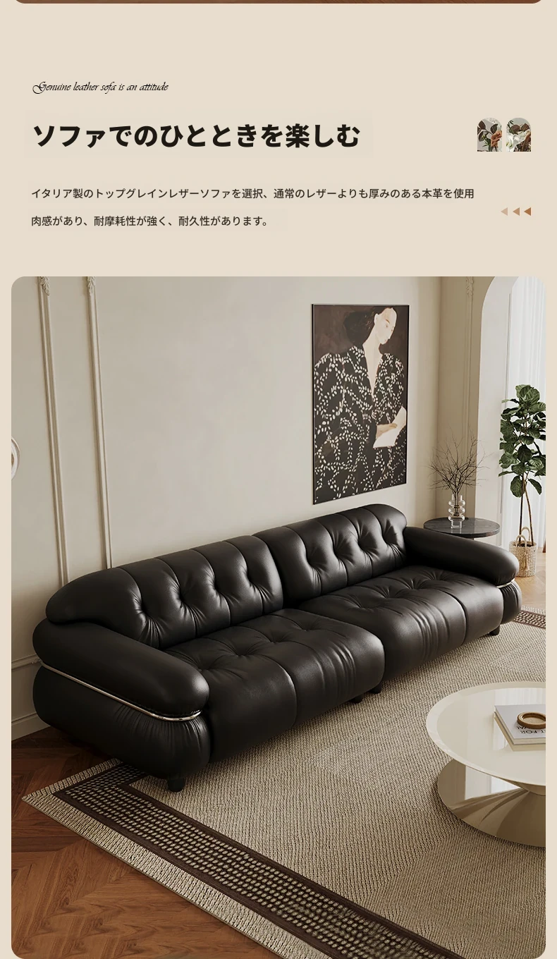 【ULLLO】エレガントフレンチモダンリビングソファー - 軽奢ヴィンテージ風ブラック本革(トップグレインレザー)+ スチールフレーム