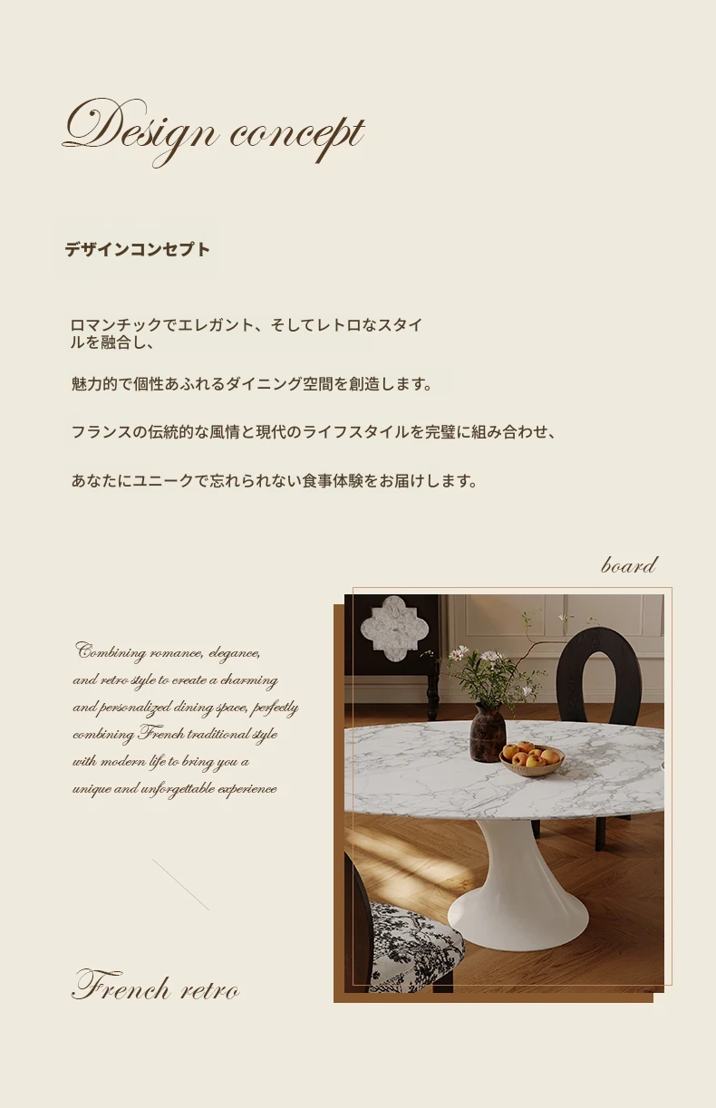 【ULLLO】エレガントなフレンチヴィンテージ風!天然大理石チューリップオーバルダイニングテーブル&カッラーラホワイトのラウンドテーブルチェアセットで上質な食卓を演出